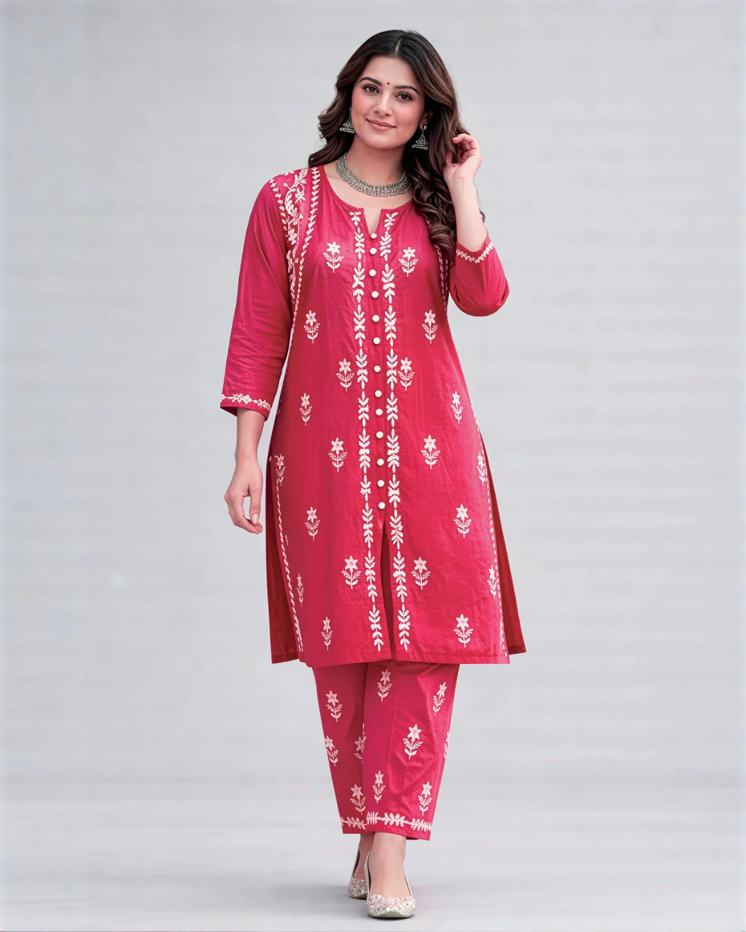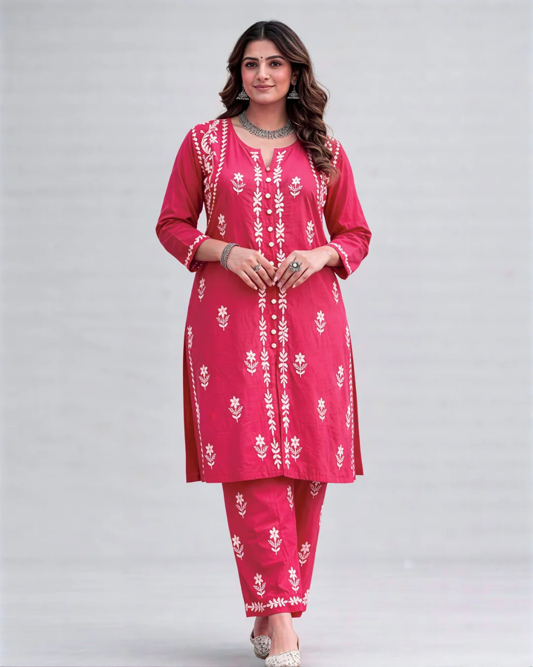 Elegant chikankari embroidered suit set featuring delicate craftsmanship. Set includes Kurta, Pant & Dupatta. Perfect for festive & daily wear.