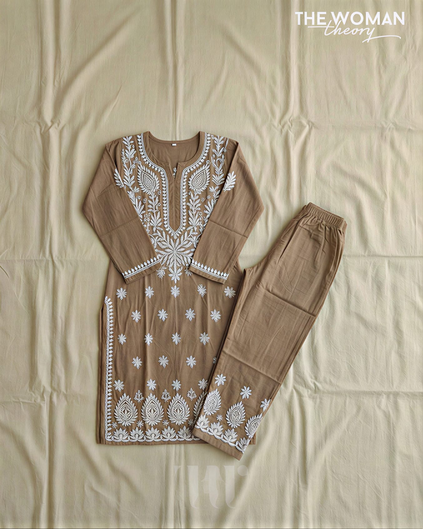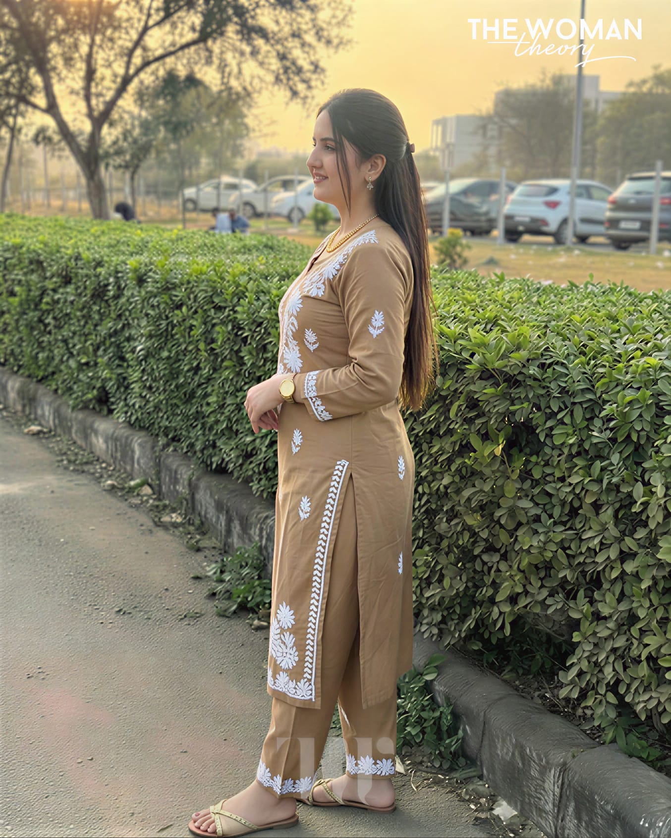 Be the first to review “Lucknowi Chikankari Suit Without Dupatta – Dark Cream”